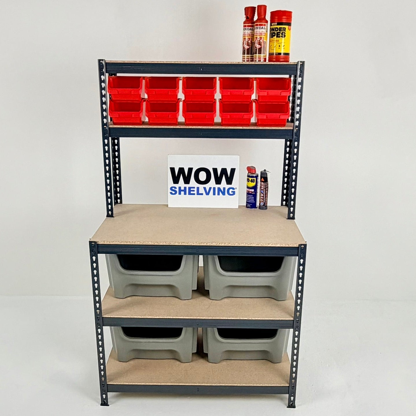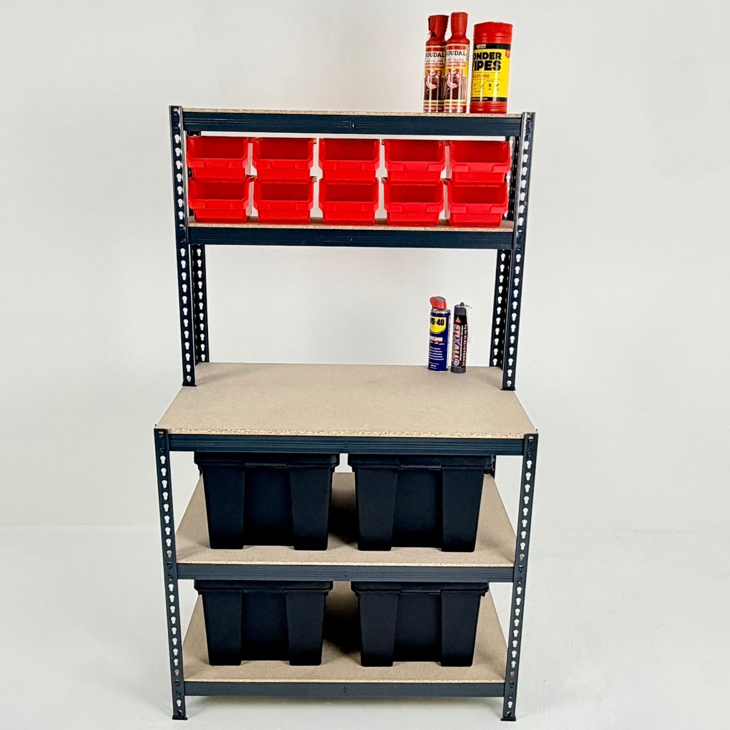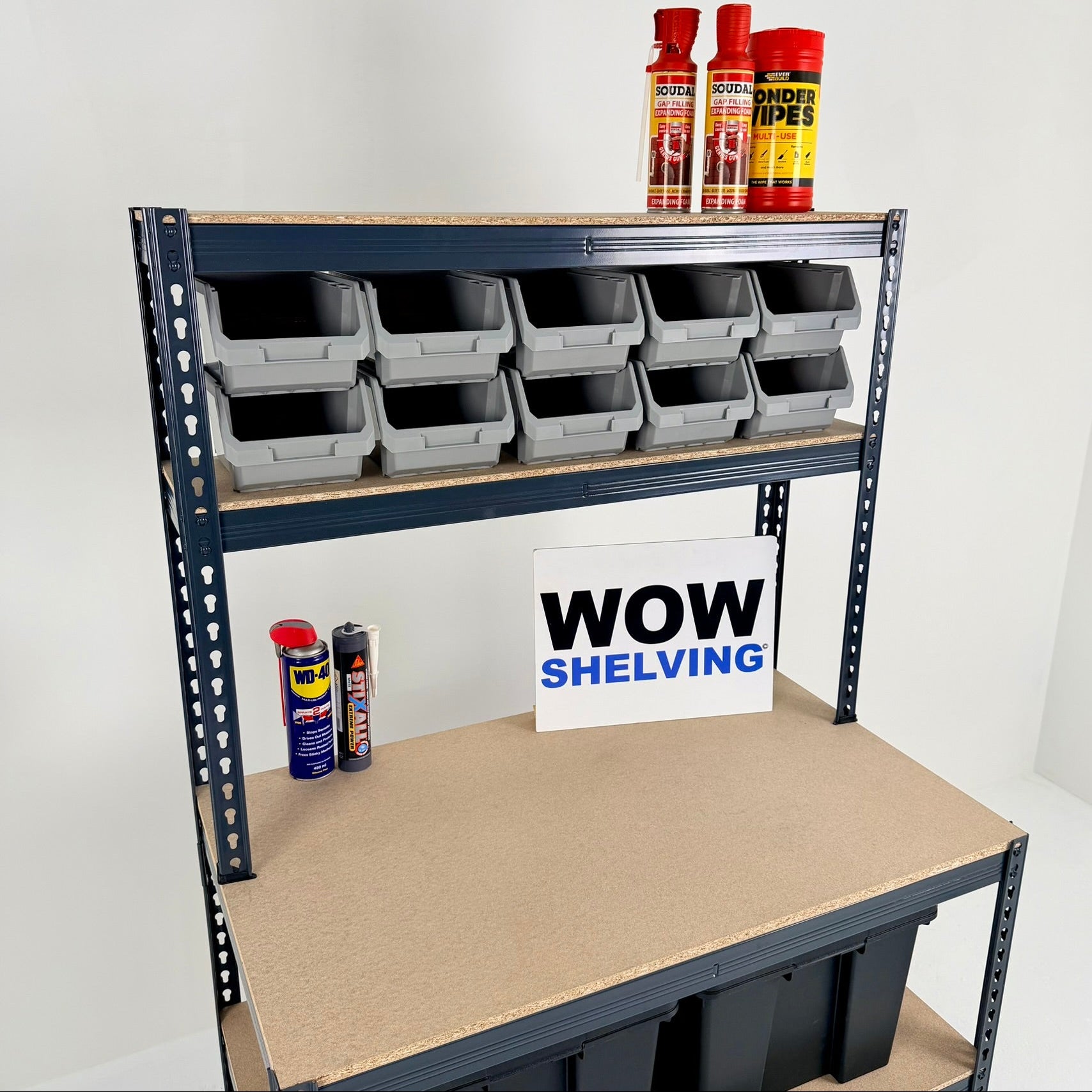 A range of heavy-duty shelving, storage bin kits, and workbenches all with 250kg UDL capacity - ideal for home and industrial use
