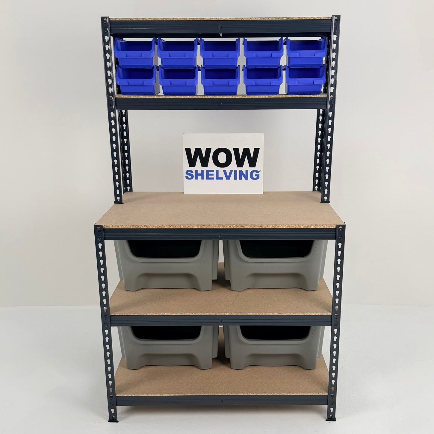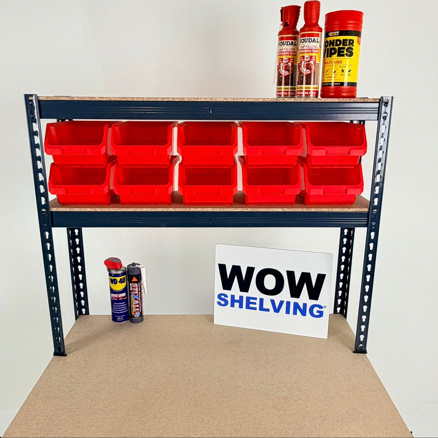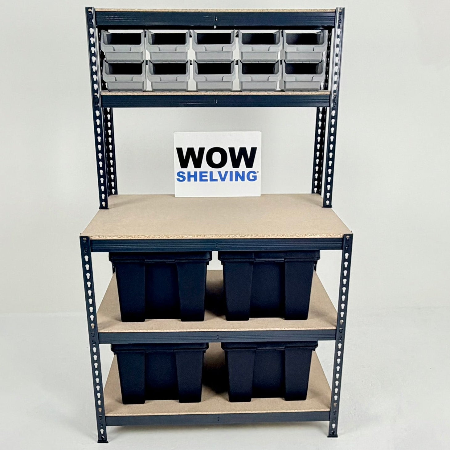 A range of heavy-duty shelving, storage bin kits, and workbenches all with 250kg UDL capacity - ideal for home and industrial use