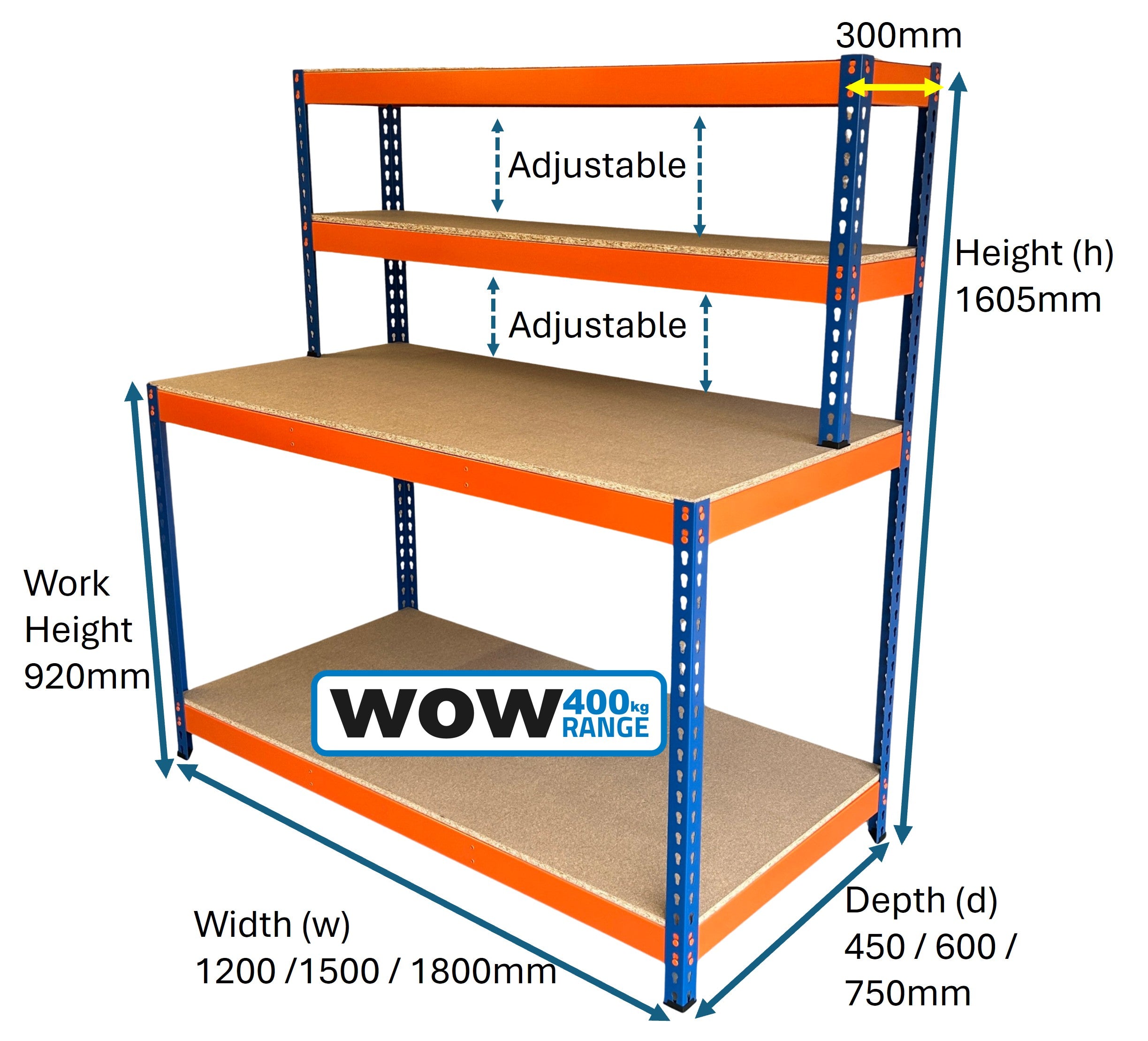 - Available in multiple widths and depths, and fully compatible with the WOW400 shelving range, these workstations can be scaled and adapted as your business needs evolve. Choose either a four or five level option, as standard with two top shelves and then either two or three main (lower) levels. All shelves are height adjustable so you can build the workstation around your needs.